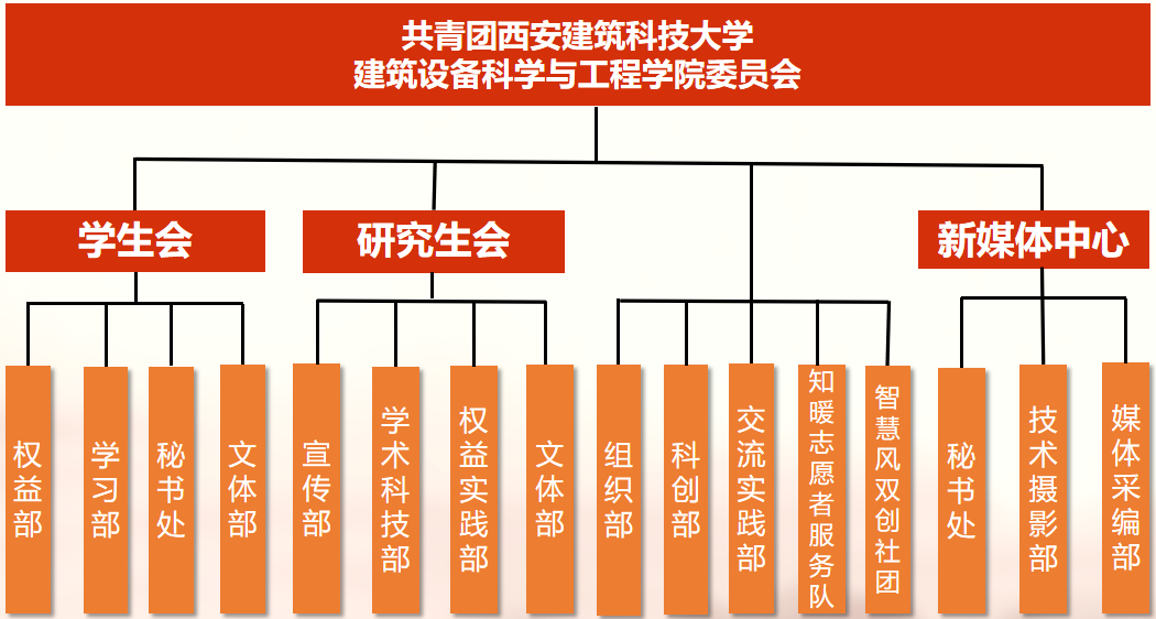 建科团委目前下设组织部、科创部、交流实践部、“知暖”志愿者服务队、智慧风双创社团,指导院学生会、研究生会、新媒体中心的日常工作。学院目前共有团支部49个,其中本科生36个,硕士研究生12个,博士研究生1个。共青团员共1093人,本科生团支部733名团员,占团员总数67.06%;硕士研究生团支部335名团员,占比30.65%;博士研究生团支部25名团员,占比2.29%。